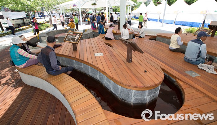 (대전=포커스뉴스) 유성온천문화축제를 하루 앞둔 12일 오전 대전 유성구 유성온천문화공원 족욕장을 찾은 시민들이 족욕을 하고 있다. 유성온천문화축제는 13일부터 15일까지 열리며 국내 최초로 한방족욕카페를 개장해 태양인과 태음인, 소양인, 소음인 사상체질별 맞춤 족욕장을 운영한다.