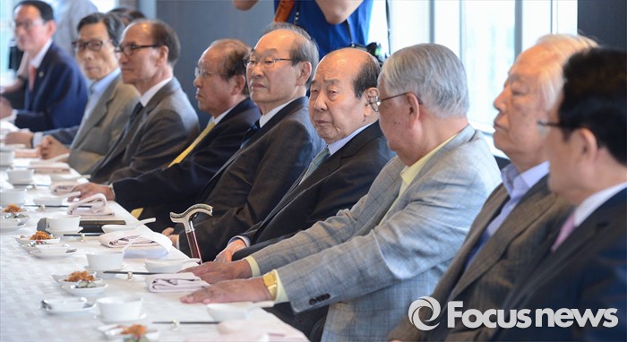 (서울=포커스뉴스) 김수한(오른쪽 네번째) 새누리당 상임고문 등이 12일 오후 서울 여의도 한 중식당에서 정진석 새누리당 원내대표 등 원내지도부와 오찬을 하고 있다.