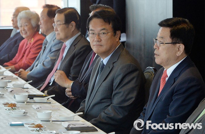 (서울=포커스뉴스) 정진석(오른쪽 두번째) 새누리당 원내대표와 김광림(오른쪽 첫번째) 정책위의장 등이 12일 오후 서울 여의도 한 중식당에서 상임고문단과 오찬을 하고 있다.