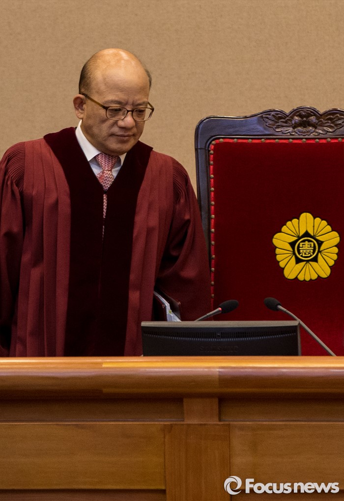 (서울=포커스뉴스) 한글을 우리 고유문자로 규정한 현행법이 헌법에 어긋나는지를 판단하는 '국어기본법 제3조' 등에 대한 공개변론이 12일 오후 서울 종로구 헌법재판소 대심판정에서 열렸다. 이날 변론에 참석한 박한철 헌법재판소장이 착석하고 있다.