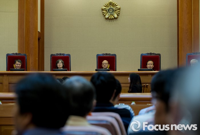 (서울=포커스뉴스) 한글을 우리 고유문자로 규정한 현행법이 헌법에 어긋나는지를 판단하는 '국어기본법 제3조' 등에 대한 공개변론이 12일 오후 서울 종로구 헌법재판소 대심판정에서 열렸다. 이날 변론에 참석한 헌법재판관들이 취재진의 퇴장을 기다리고 있다.