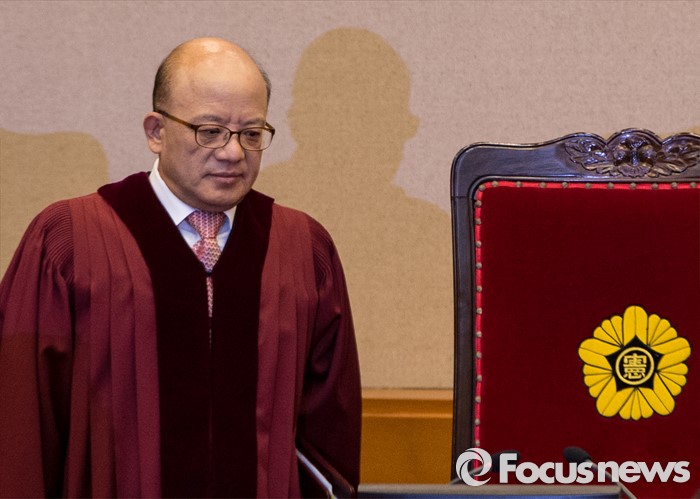 (서울=포커스뉴스) 한글을 우리 고유문자로 규정한 현행법이 헌법에 어긋나는지를 판단하는 '국어기본법 제3조' 등에 대한 공개변론이 12일 오후 서울 종로구 헌법재판소 대심판정에서 열렸다. 이날 변론에 참석한 박한철 헌법재판소장이 착석하고 있다.