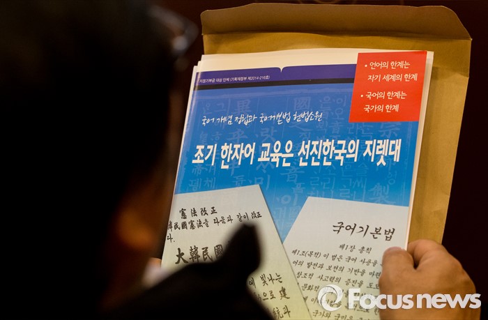 (서울=포커스뉴스) 한글을 우리 고유문자로 규정한 현행법이 헌법에 어긋나는지를 판단하는 '국어기본법 제3조' 등에 대한 공개변론이 12일 오후 서울 종로구 헌법재판소 대심판정에서 열렸다. 이날 변론에 참석한 방청객이 조기 한자어 교육을 찬성하는 인쇄물을 보고 있다.