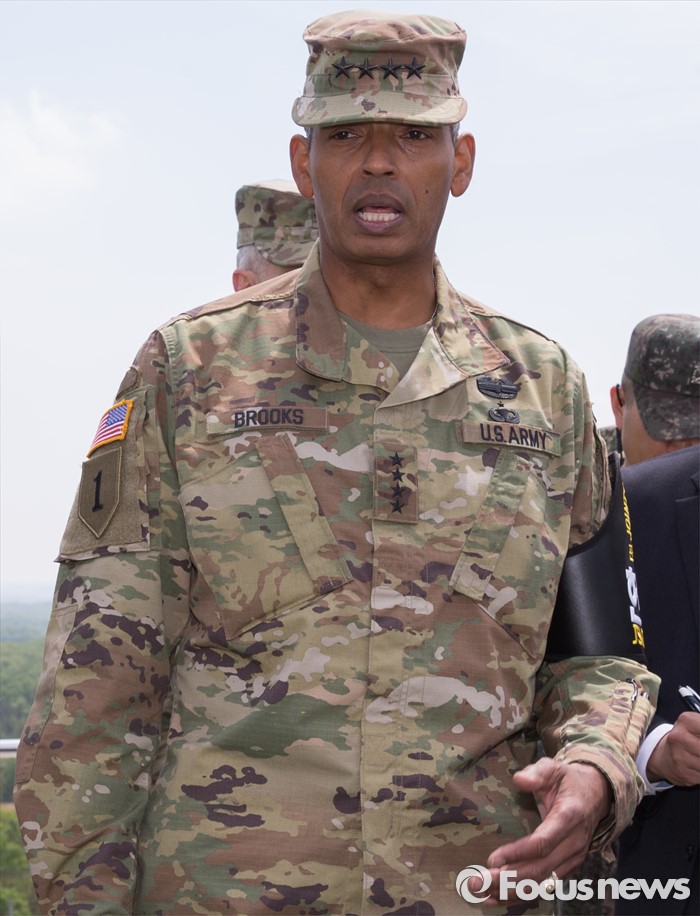 (파주=포커스뉴스) 빈센트 브룩스 신임 한·미연합사령관 겸 주한미군사령관이 12일 오후 경기도 파주시 JSA(공동경비구역)를 방문, 오울렛 초소에서 인사말을 하고 있다.