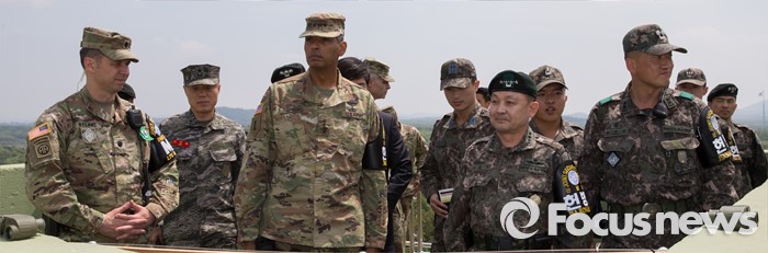 (파주=포커스뉴스) 빈센트 브룩스(왼쪽 세번째) 신임 한·미연합사령관 겸 주한미군사령관과 이순진(왼쪽 다섯번째) 합참의장이 12일 오후 경기도 파주시 JSA(공동경비구역)를 방문, 오울렛 초소에서 관계자로부터 설명을 듣고 있다.