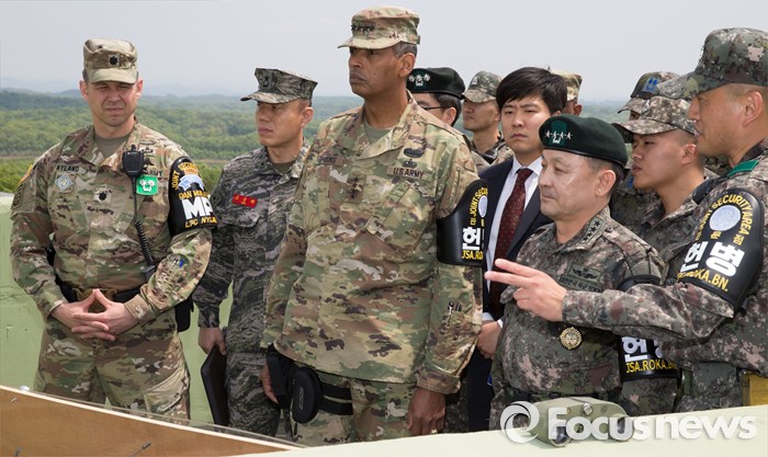 (파주=포커스뉴스) 빈센트 브룩스(왼쪽 세번째) 신임 한·미연합사령관 겸 주한미군사령관과 이순진(오른쪽 세번째) 합참의장이 12일 오후 경기도 파주시 JSA(공동경비구역)를 방문, 오울렛 초소에서 관계자로부터 설명을 듣고 있다.