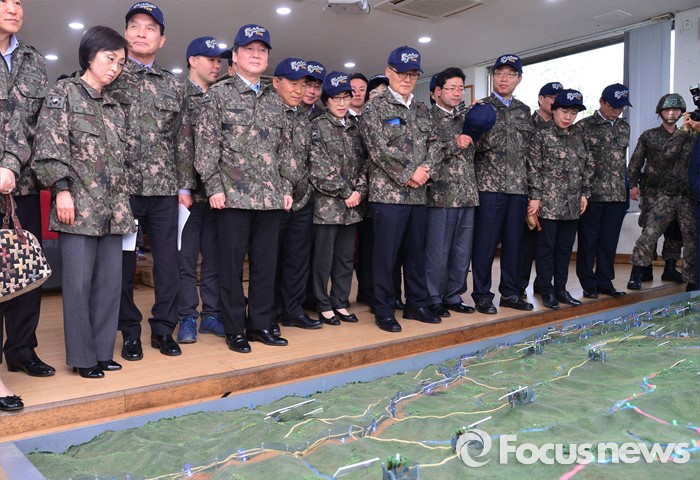 (연천=포커스뉴스) 안철수 국민의당 상임공동대표, 박지원 원내대표 등 의원 및 당선인들이 12일 오전 경기도 연천 전방부대를 방문해 경계작전 현황을 보고 있다.