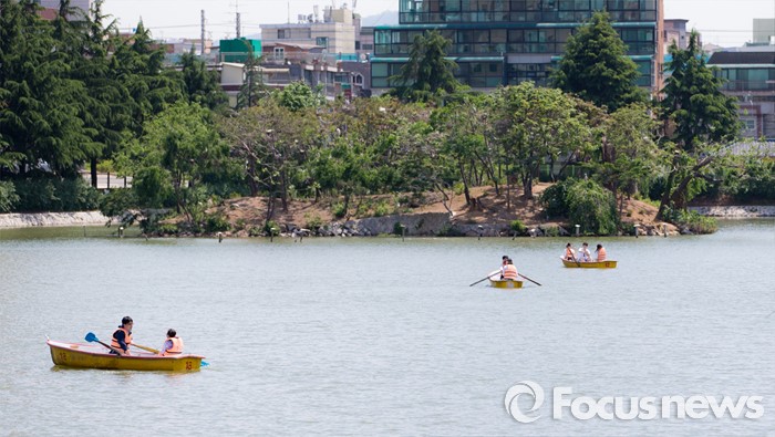 (서울=포커스뉴스) 전국이 맑고 초여름 날씨를 보인 12일 오후 서울 광진구 건국대학교 일감호에서 학생들이 보트를 타고 있다.