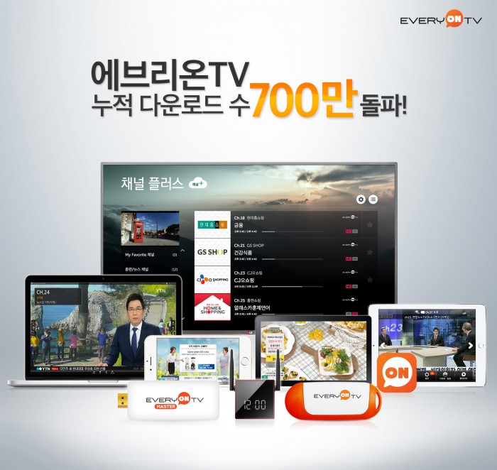 (서울=포커스뉴스) 현대HCN의 무료 N스크린 TV 서비스인 에브리온TV가 누적 다운로드 700만 건을 12일 돌파했다.