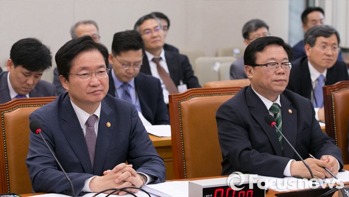 (서울=포커스뉴스) 12일 오후 서울 여의도 국회에서 열린 농림축산식품해양수산위원회 전체회의에 참석한 이동필(오른쪽) 농림축산식품부 장관, 김영석 해양수산부 장관이 의원들의 발언을 듣고 있다.