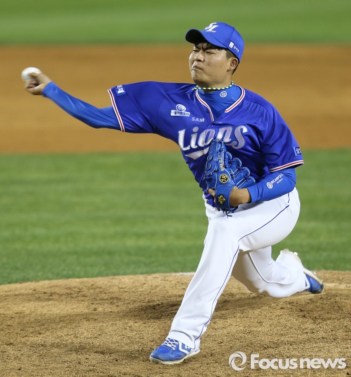 (서울=포커스뉴스) 12일 서울 잠실구장에서 열린 2016 프로야구 삼성-LG 경기에서 9회말 마운드에 오른 삼성 투수 심창민이 힘차게 공을 뿌리고 있다.