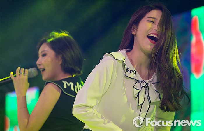 (서울=포커스뉴스) 12일 오후 서울 광진구 건국대학교 대운동장에서 열린 '2016 건국대학교 대동제'에서 걸그룹 마마무 멤버 화사(왼쪽), 솔라가 무대를 선보이고 있다.