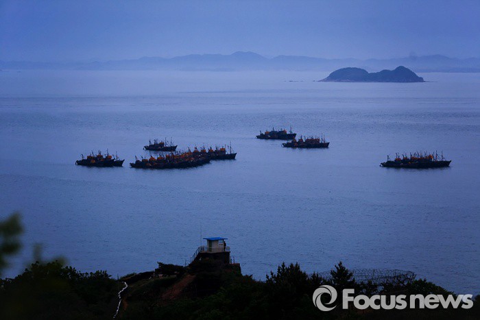 (연평도=포커스뉴스) 중국어선들이 북방한계선(NLL)을 넘어 우리측 해역에서 조업이 성행 하지만, 단속의 손길이 미치지 못하고 있다. 사진은 우리측 해역에 인접 조업에 앞서 밤을 지새고 있는 중국 어선들. 뒤편으로 보이는 섬과 육지는 북한 땅이다.(자료사진)