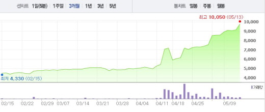 보성파워텍은 13일 오전 9시33분 현재 전일 대비 6.78%(610원) 상승한 9760원에 거래되고 있다. 이는 2달 전 주가인 3월14일(3930원)과 비교했을 때 2.48배 상승한 수치다.