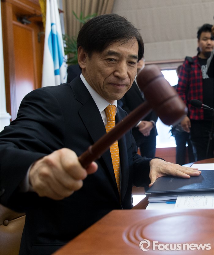 (서울=포커스뉴스) 이주열 한국은행 총재가 13일 오전 서울 중구 남대문로 한국은행에서 열린 금융통화위원회에 참석해 개회를 알리는 의사봉을 두드리고 있다.
