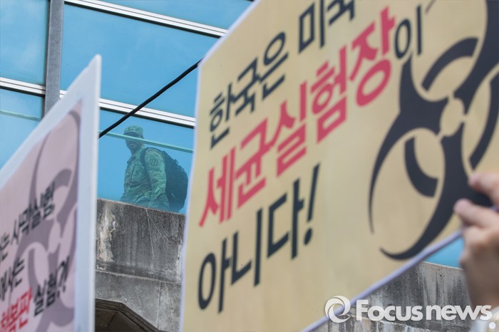 (서울=포커스뉴스) 13일 오전 서울 용산구 미8군 2번 게이트 앞에서 전쟁반대평화실현국민행동을 비롯한 시민단체 회원들이 '서울 한복판 지카바이러스 실험추진, 주한미군 규탄 기자회견'을 하고 있다.
