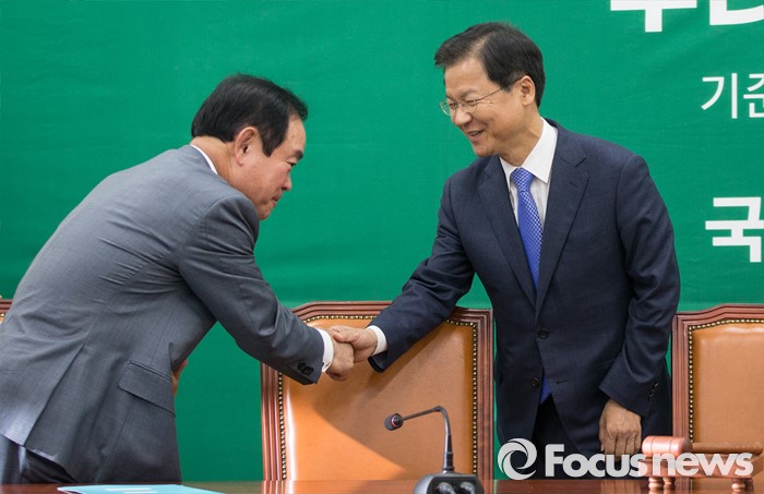 (서울=포커스뉴스) 천정배(왼쪽) 국민의당 상임공동대표와 장병완 의원이 13일 오전 서울 여의도 국회에서 열린 최고위원회의에 참석해 인사하고 있다.