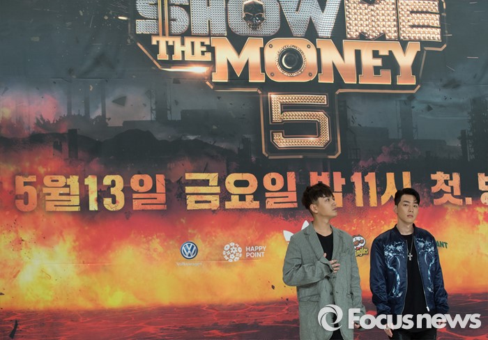 (서울=포커스뉴스) 13일 오전 서울 영등포구 타임스퀘어 아모리스홀에서 열린 Mnet '쇼미더머니5' 제작발표회에 참석한 래퍼 사이먼도미닉(왼쪽)과 그레이가 포토타임을 갖고 있다.