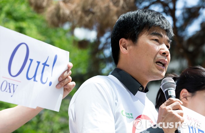 (서울=포커스뉴스) 13일 오전 서울 중구 롯데마트 서울역점 앞에서 염형철 환경운동연합 사무총장이 '옥시 제품 즉각 판매 중단'을 촉구하고 있다.