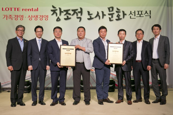 롯데렌탈 류경오 노조의원장은 "롯데렌탈은 M&A(인수합병)라는 두 차례의 커다란 변화에도 노사간 소통과 화합을 통해 상호신뢰와 협력적 노사관계를 이루어 낸 결과 지금까지 흔들림 없이 지속 성장할 수 있었다"며 "회사 없이는 노조도 없다는 신념 아래 노조가 앞장서 회사 발전을 이끌겠다"고 화답했다.