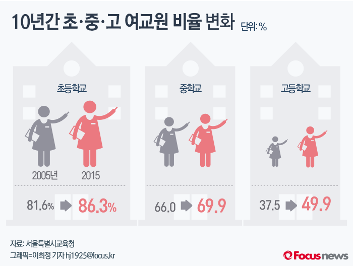(서울=포커스뉴스) 서울특별시교육청 자료에 따르면 지난 10년간 초·중·고 여교원의 비율은 꾸준히 증가하고 있다.