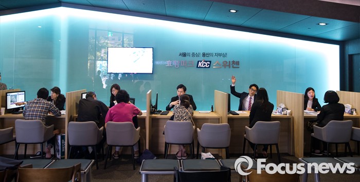 (서울=포커스뉴스) 이달 6만 8천여 가구라는 물량이 쏟아져 5월 분양전쟁이 예상되는 가운데 서울 용산구 효창동 KCC 스위첸 견본주택이 방문한 시민들로 붐비고 있다.