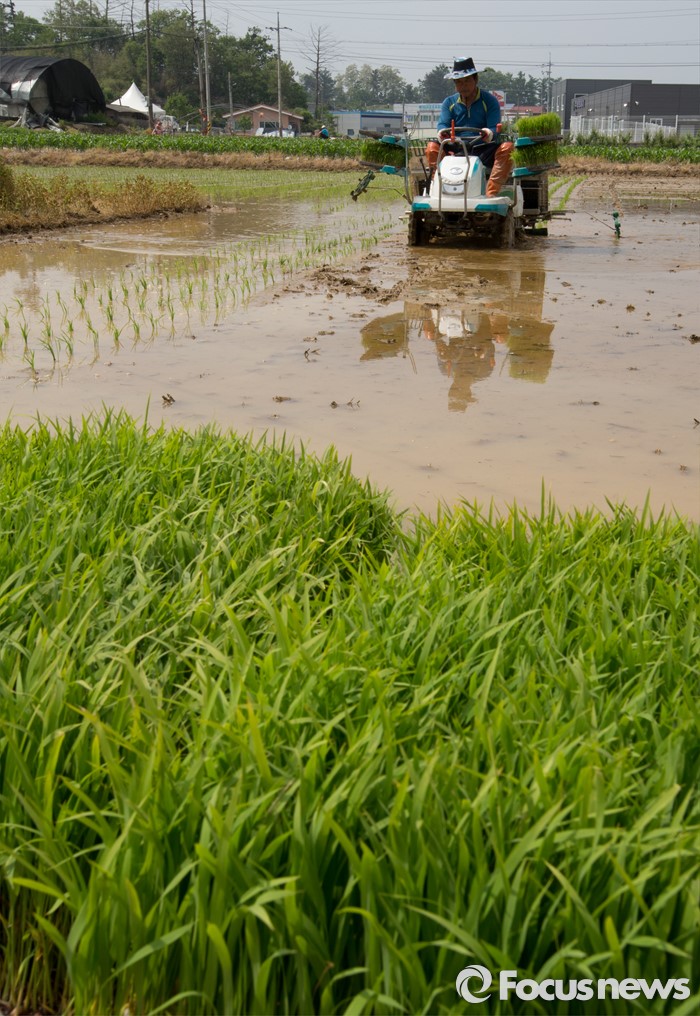(청주=포커스뉴스) 13일 오후 충북 청주시 서원구의 한 논에서 농민이 이양기를 이용해 모내기를 하고 있다.