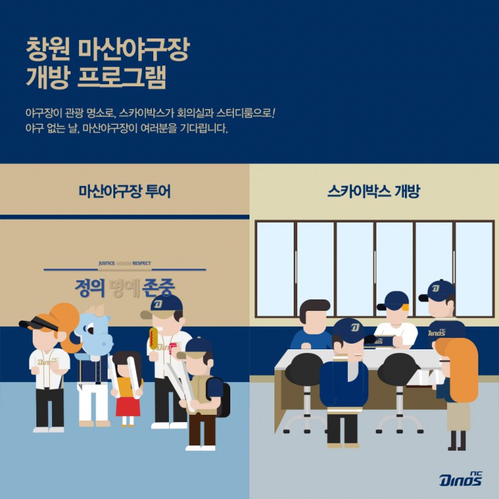 또 사전 신청자에 한해 스카이박스를 스터디룸이나 회의실로 활용할 수 있도록 했다. 스카이박스 사용 시 1인당 1000원을 내야 한다.프로야구 NC가 올시즌 홈경기가 없는 날 야구장 투어와 스카이박스 대여를 시작한다. 사진은 창원 마산야구장 개방 프로그램 안내 포스터. <사진제공=NC 다이노스>