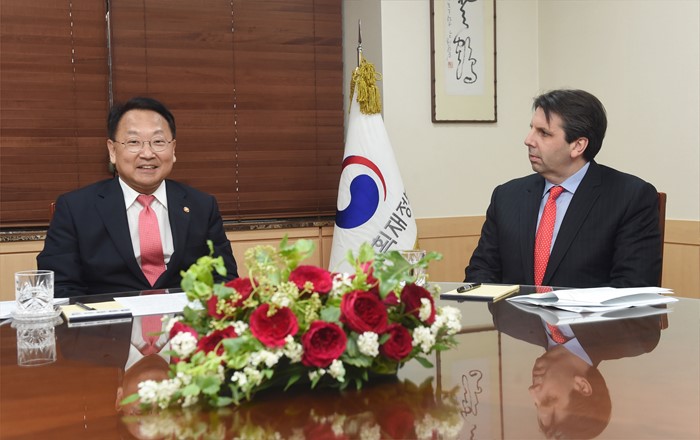 (서울=포커스뉴스) 13일 서울 종로구 정부서울청사에서 유일호(왼쪽) 경제부총리 겸 기획재정부 장관이 마크 리퍼트 주한 미국대사와 면담 하고 있다. <사진제공=기획재정부>