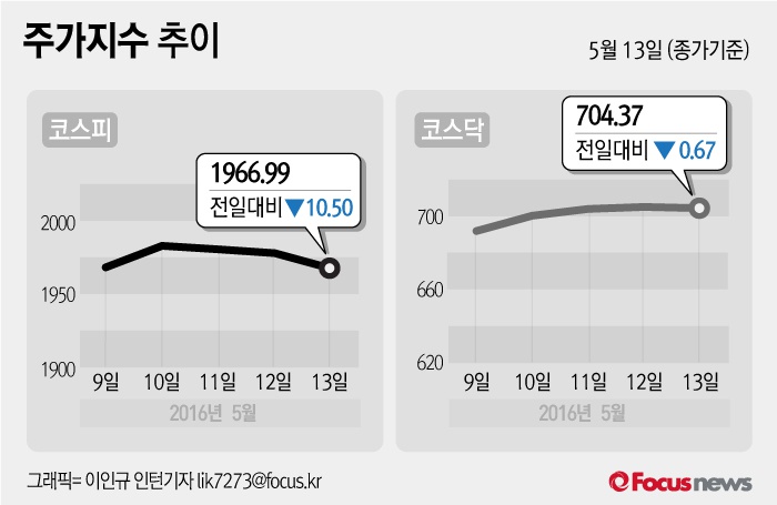 (서울=포커스뉴스) 13일 코스피지수는 전날 보다 0.53%(10.50포인트) 내린 1966.99에 장을 마쳤다. 코스닥지수는 전일 대비 0.10%(0.67포인트) 내린 704.37에 마감했다.