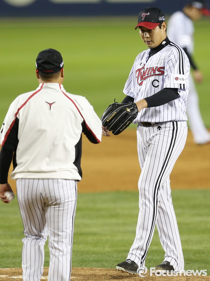(서울=포커스뉴스) 13일 서울 잠실구장에서 열린 2016 프로야구 SK-LG 경기 7회초 2사 1루에서 LG 선발투수 류제국의 교체를 위해 강상수 투수코치가 마운드로 올라가고 있다.