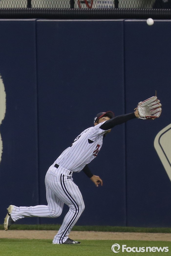 (서울=포커스뉴스) 13일 서울 잠실구장에서 열린 2016 프로야구 SK-LG 경기 6회초 1사 1루에서 LG 우익수 이천웅이 SK 이재원의 외야 뜬공을 달려가며 잡고 있다.