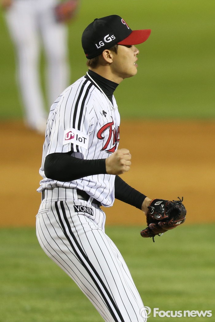 (서울=포커스뉴스) 13일 서울 잠실구장에서 열린 2016 프로야구 SK-LG 경기에서 SK를 2-1로 물리친 LG의 마무리 투수 임정우가 SK 마지막 타자 고메즈를 삼진 아웃 시키고 주먹을 불끈 쥐고 있다.