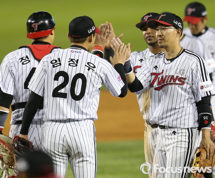 (서울=포커스뉴스) 13일 서울 잠실구장에서 열린 2016 프로야구 SK-LG 경기에서 SK를 2-1로 물리친 LG의 마무리 투수 임정우와 정성훈이 하이파이브하고 있다.