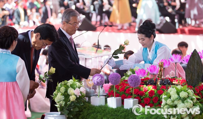(서울=포커스뉴스) 14일 오전 서울 종로구 조계사 대웅전에서 열린 불기 2560년 부처님 오신날 봉축 법요식에서 정진석 새누리당 원내대표와 김종인 더불어민주당 비대위 대표가 헌화하고 있다.