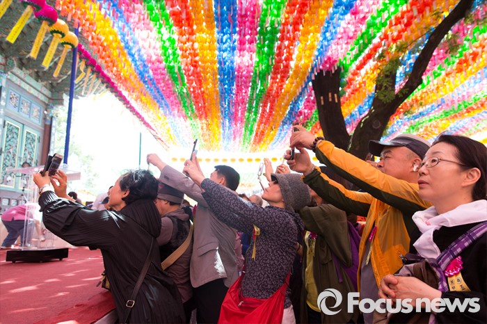 (서울=포커스뉴스) 14일 오전 서울 종로구 조계사 대웅전에서 열린 불기 2560년 부처님 오신날 봉축 법요식에서 불교신자들이 부처님을 기념촬영하고 있다.