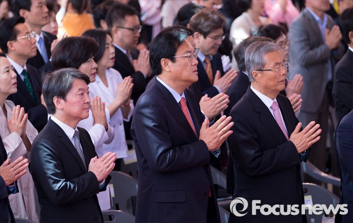(서울=포커스뉴스) 14일 오전 서울 종로구 조계사 대웅전에서 열린 불기 2560년 부처님 오신날 봉축 법요식에서 김종인(오른쪽부터) 더불어민주당 비대위 대표와 정진석 새누리당 대표, 안철수 국민의당 상임공동대표가 합장하고 있다.