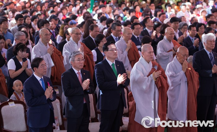 (서울=포커스뉴스) 14일 오전 서울 종로구 조계사 대웅전에서 열린 불기 2560년 부처님 오신날 봉축 법요식에서 내빈들이 합장하고 있다. 오른쪽부터 원로회의 의장 밀운 스님, 총무원장 자승 스님, 정의화 국회의장, 김종덕 문화체육관광부 장관, 박원순 서울시장.