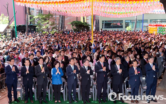 (서울=포커스뉴스) 14일 오전 서울 종로구 조계사 대웅전에서 열린 불기 2560년 부처님 오신날 봉축 법요식에서 내빈들이 합장하고 있다. 오른쪽 세번째부터 김종인 더불어민주당 비대위 대표, 정진석 새누리당 원내대표, 안철수 국민의당 상임공동대표, 천정배 국민의당 공동대표, 심상정 정의당 대표, 우상호 더불어민주당 원내대표, 정세균 의원.