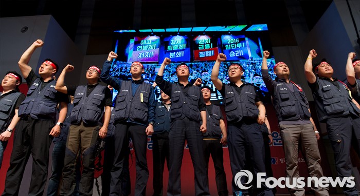 (서울=포커스뉴스) 14일 오후 서울 강서구 KBS스포츠월드에서 성과연봉제 저지를 위한 금융공기업지부 합동 대의원대회에 참석한 금융노조 조합원들이 구호를 외치고 있다.