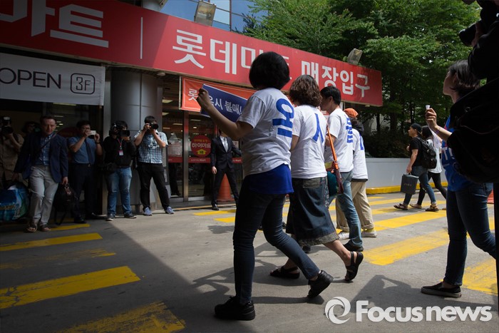 (서울=포커스뉴스) 15일 오전 서울 용산구의 한 대형마트 앞에서 환경운동연합원들이 옥시 불매를 촉구하며 마트로 향하고 있다.