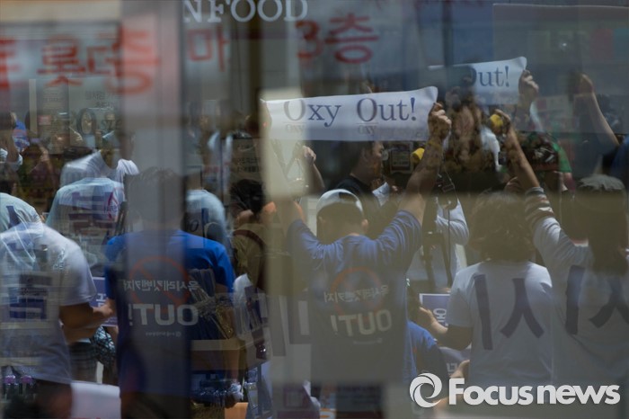 (서울=포커스뉴스) 15일 오전 서울 용산구의 한 대형마트 앞에서 환경운동연합원들이 옥시 불매를 촉구하며 기자회견을 하고 있다.