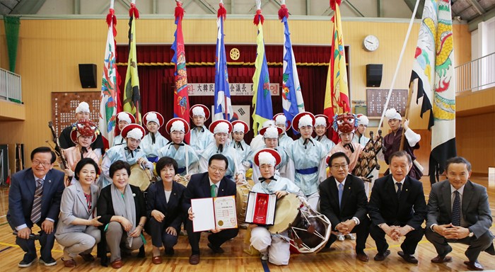 (서울=포커스뉴스) 일본을 방문 중인 정의화(앞줄 왼쪽 다섯번째) 국회의장 일행이 15일 오전 오사카 소재 민족학교인 건국학교를 방문해 전통예술부 단원들을 격려한 뒤 기념촬영을 하고 있다. <사진제공=국회>