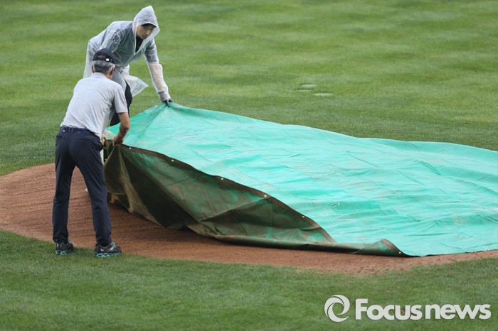 (서울=포커스뉴스) 15일 서울 잠실구장에서 열린 2016 프로야구 SK-LG 경기가 2회말을 마치고 우천으로 경기가 중단되자 구장 관리직원들이 투수 마운드에 비가림막을 설치하고 있다.