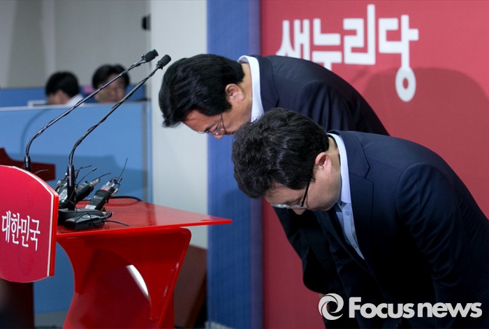 (서울=포커스뉴스) 정진석(왼쪽) 새누리당 원내대표가 15일 오후 서울 여의도 당사에서 혁신위원장으로 임명된 김용태 의원과 함께 기자회견에 앞서 인사하고 있다.