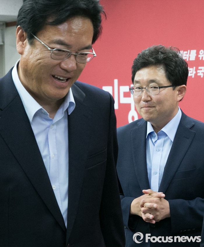 (서울=포커스뉴스) 정진석(왼쪽) 새누리당 원내대표와 혁신위원장으로 임명된 김용태 의원이 15일 오후 서울 여의도 당사에서 기자회견을 마친 뒤 퇴장하고 있다.