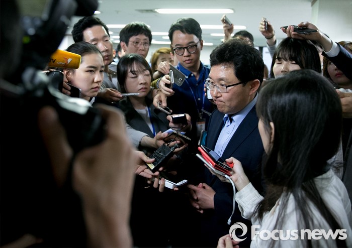 (서울=포커스뉴스) 새누리당 혁신위원장으로 임명된 김용태 의원이 15일 오후 서울 여의도 당사에서 기자회견을 마친 뒤 취재진 질문에 답하고 있다.
