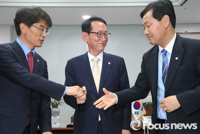 (서울=포커스뉴스) 김도읍(가운데) 새누리당 원내수석부대표, 박완주(왼쪽) 더불어민주당 원내수석부대표, 김관영 국민의당 원내수석부대표가 15일 오후 서울 여의도 국회 의원회관에서 19대 국회 마지막 본회의 안건 및 20대 국회 원구성 협상 등을 논의를 위한 회동에 앞서 인사하고 있다.