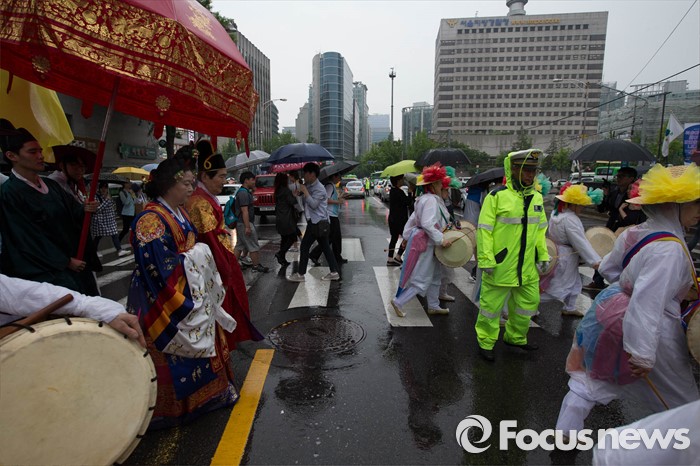 (서울=포커스뉴스) 세종대왕 탄신 619주년인 15일 오후 서울 종로구 통인시장 일대에서 세종대왕 어가행렬이 재현되고 있다.