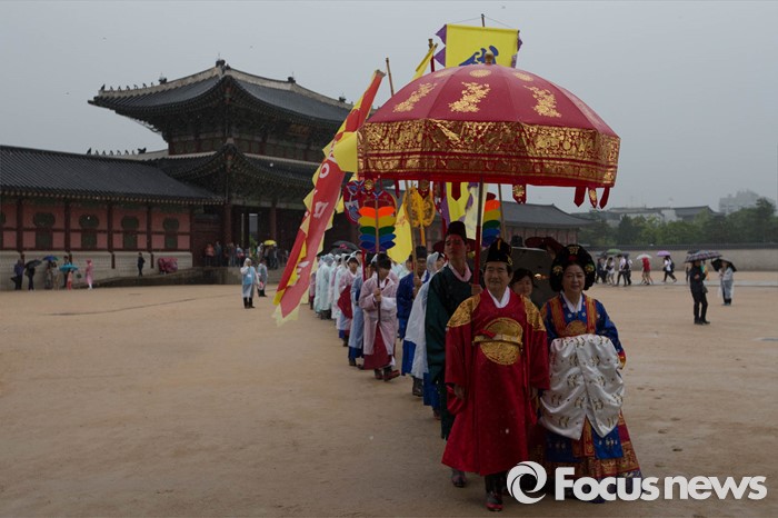 (서울=포커스뉴스) 세종대왕 탄신 619주년인 15일 오후 서울 종로구 경복궁 일대에서 세종대왕 어가행렬이 재현되고 있다.